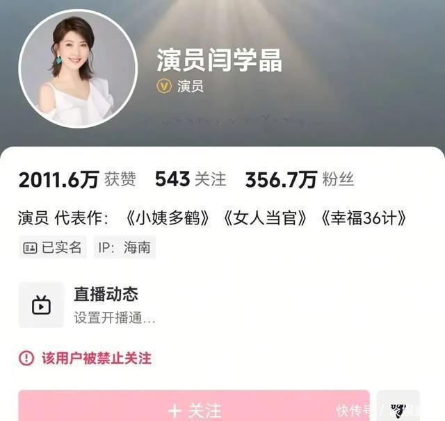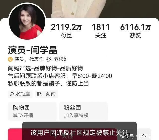 近日,演员闫学晶在直播中透露儿子一家收入,称“就挣个几十万,无法维持家庭运转”,相关言论被质疑“哭穷”,不少网友表示“要抵制闫学晶代言产品”。 1日,记者发现,闫学晶的抖音、快手等平台账号被禁止关注。